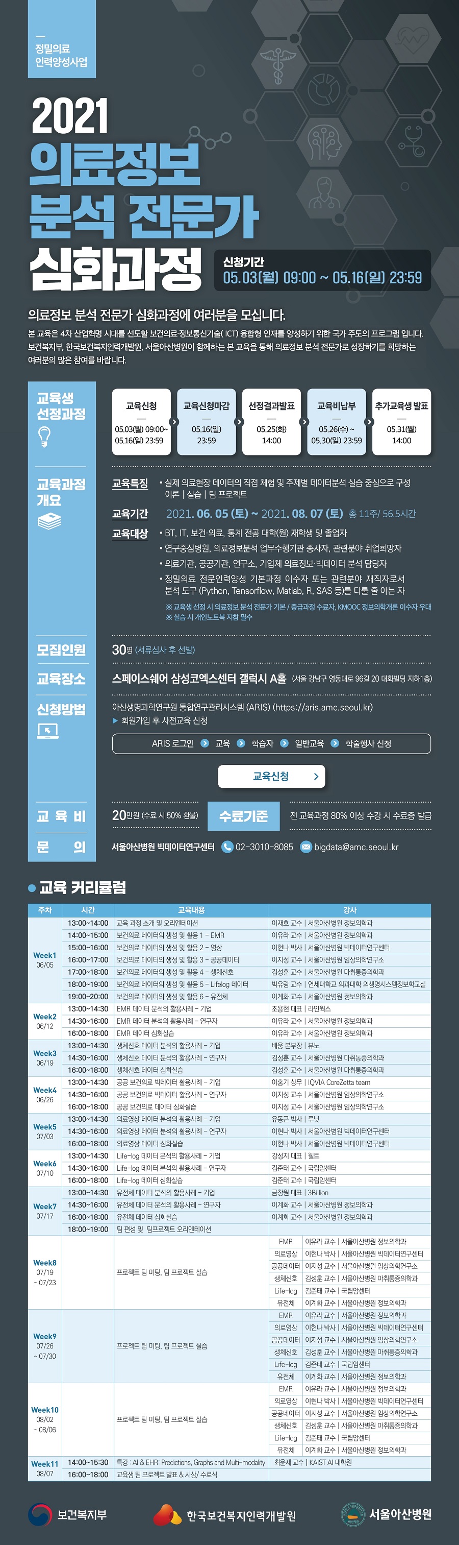 서울아산병원 빅데이터연구센터에서는 보건복지부 정밀의료인력양성사업의 일환으로 2018부터 의료정보 분석 전문가 과정을 운영하고 있으며, 2021년에는 의료데이터 활용을 위한 데이터 사이언스캠프1(R&Python) 중급과정을 2회, 심화과정을 2회 운영 예정입니다.